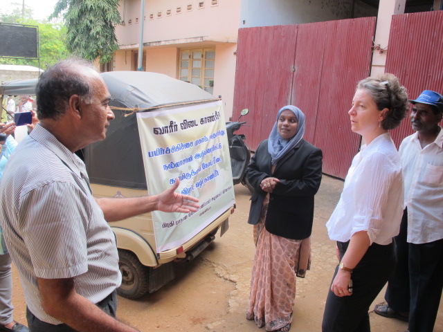 - Sakeela Banu (right), the Deputy Provincial Director of Extension in Vavuniya District, talks with Agriculture Officer M. U. P. Jayasundara from Gannoruwa about plant clinic activities in her area, including how this modified ‘tuk-tuk’ (3-wheeler) is used to announce plant clinic events. (Photo Credit: A. Rehman, CABI)
