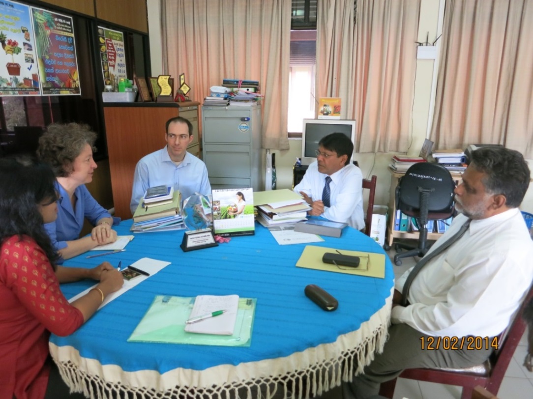 - Meeting with Dr D. B T Wijeratne (right from centre), the Additional Secretary, Agriculture Technology, of the Ministry of Agriculture, Sri Lanka, and the national coordinator for Plantwise Mr W.M.P.T Bandara (right), Deputy Director, Plant Protection Service. They discussed the progress of Plantwise since its 2013 launch in the country. “This is information that can inform policy-makers,” says Mr Bandara. (Photo Credit: A. Rehman, CABI)