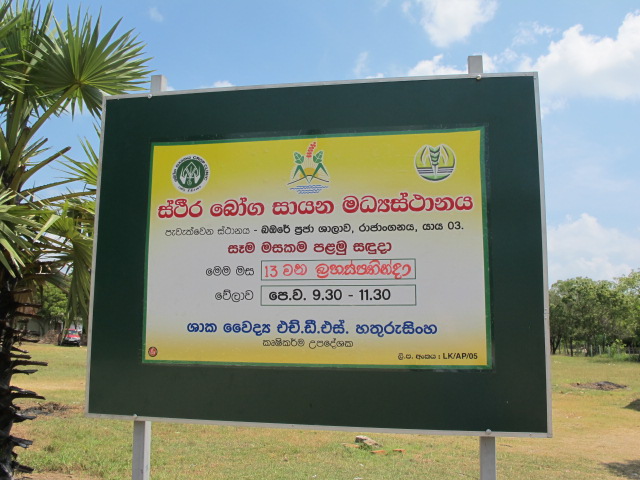 - Permanent sign in front of a plant clinic location in Anuradhapura District, indicating the fixed date and time of the plant clinic. “Here the farmers can bring their samples to a common place, and they can expect some remedy for their problems,” says Provinical Director of Extension, Mr M B Dissanayaka. (Photo Credit: W. Jenner, CABI)