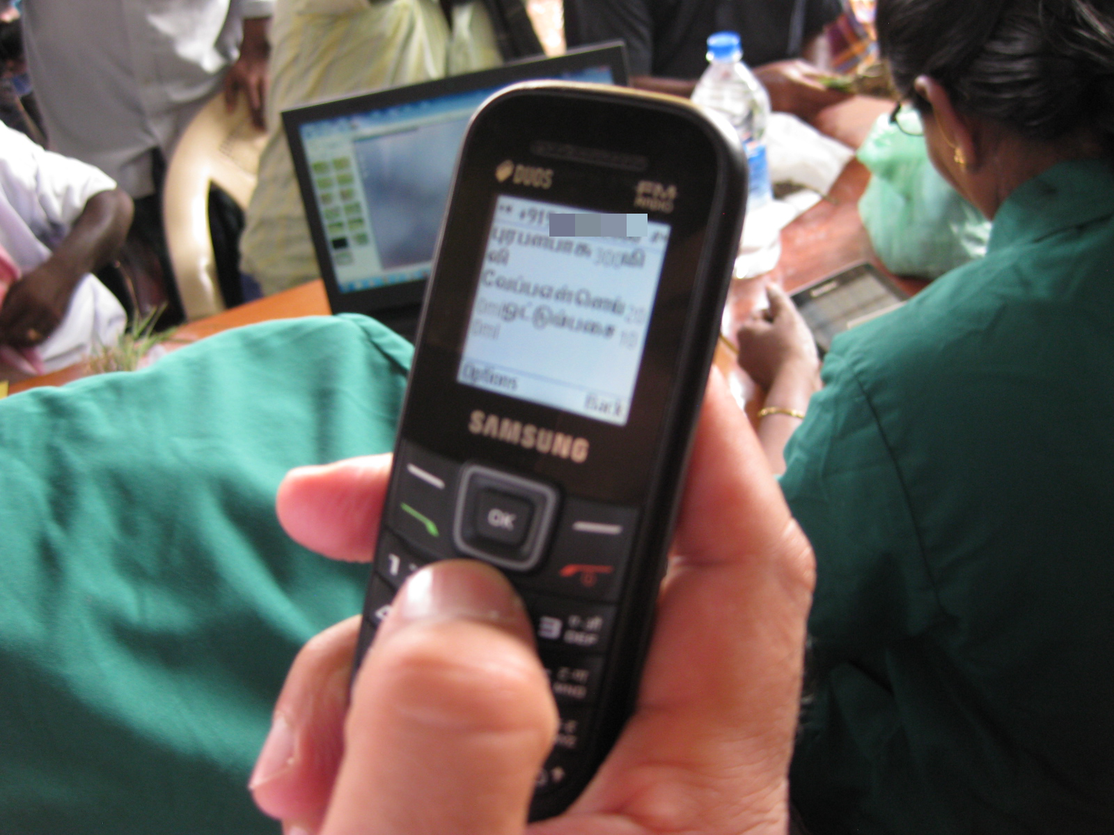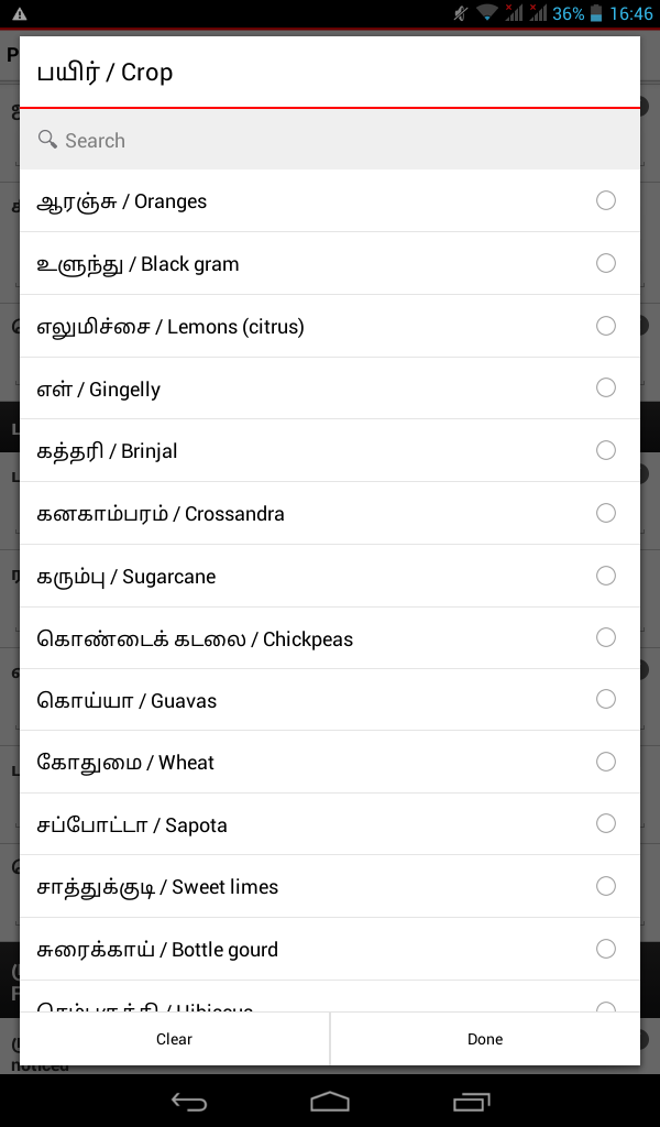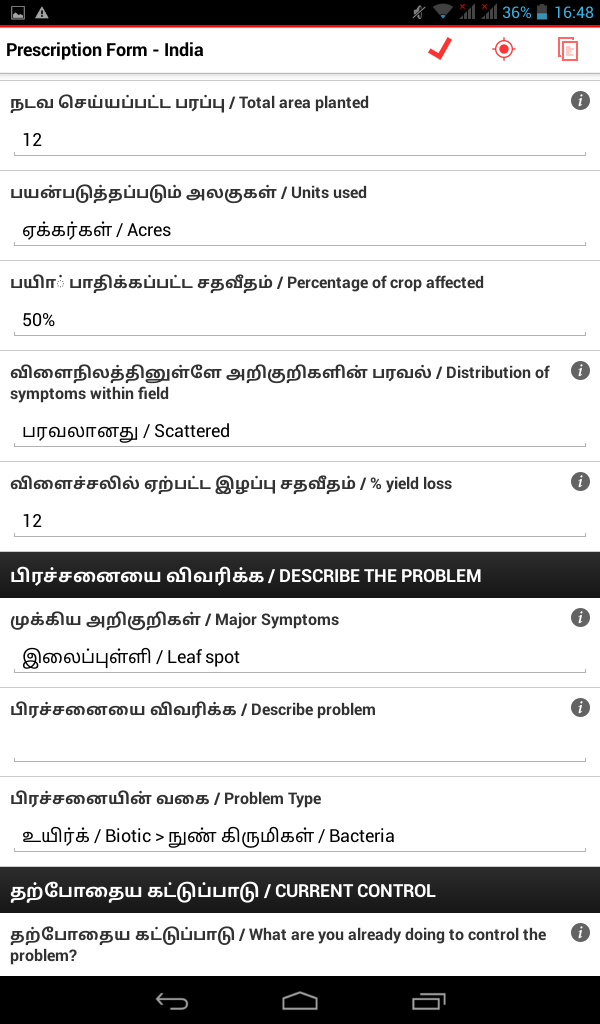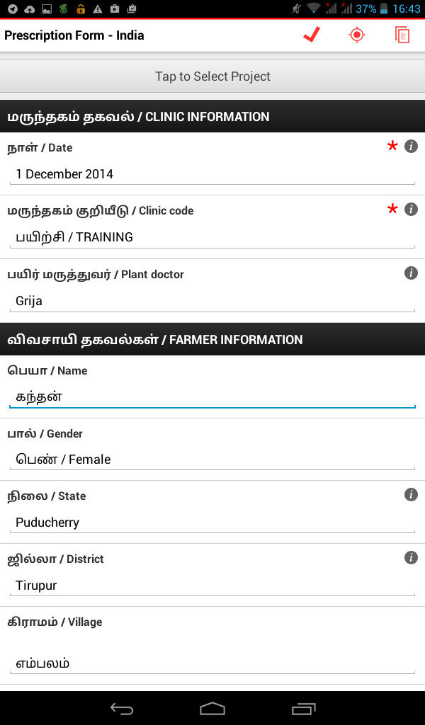 We wanted to find out if the Android tablets could be used by the plant doctors in Tamil. We also weren’t sure if the farmers’ basic mobile phones supported the display of SMS messages in the Tamil script. It was important to make sure that the data collection and SMS recommendations could work in Tamil as this is the language of the plant doctors and farmers. It was also vital that the introduction of tablets didn’t disrupt the currently functioning data flow from plant clinic to database.