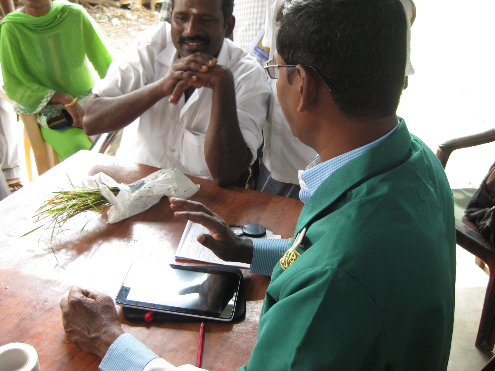 - Plant doctor, Mr Sridhar, attends to a farmer’s rice problem, using the tablet to record details about the farmer’s visit. Credit: Holly Wright © CABI