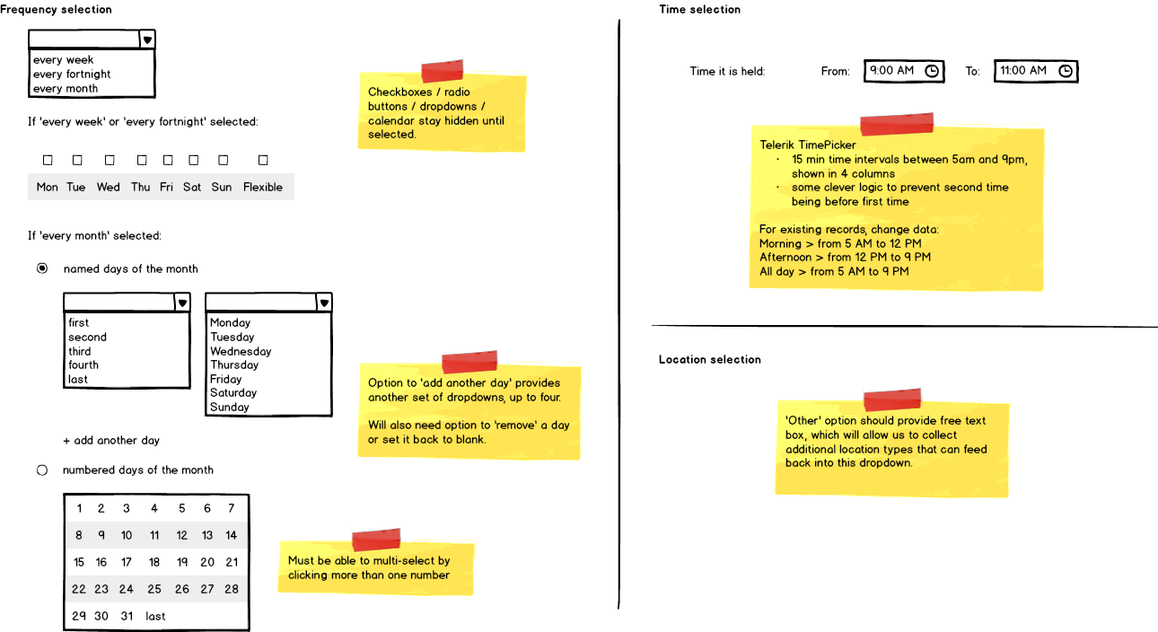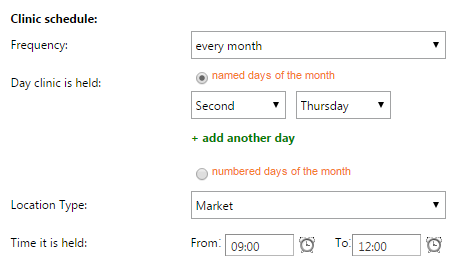 The Clinics page of POMS allows users to record, edit and download information relating to plant clinics. The clinic schedule section originally only gave a limited number of session frequency options (e.g. every week or every month but without options to specify frequencies such as ‘every second Thursday of the month’ or ‘the 4th of every month’). The images below show how this section was developed to provide more options.