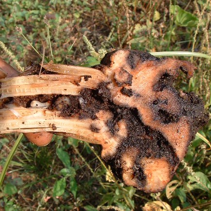 - Larvae of the banana weevil feeding their way through the rhizome and pseudostem of a young banana plant.
