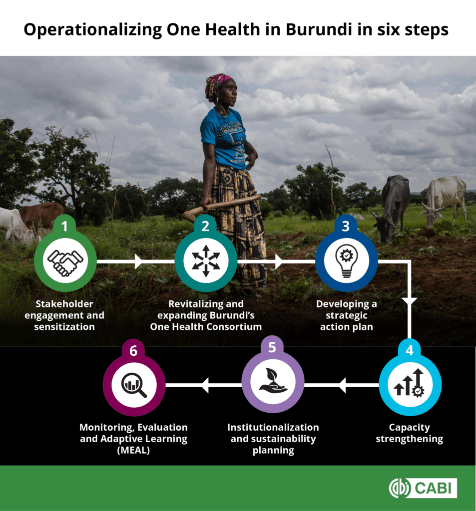 One Health in Burundi presents a solution to a complex set of challenges. This East African country faces health issues that threaten its people, livestock, and crops. Agriculture is the nation’s backbone, providing almost 95% of the country’s food and contributing to over one-third of its GDP. However, the sector has been confronted with challenges. These include climate change, disease outbreaks, and limited veterinary services. Combined, they leave smallholder farmers and rural communities highly vulnerable to food insecurity and poverty.